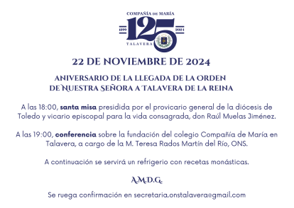 El próximo 22 de noviembre se cumplen 125 años de la llegada de las monjas fundadas por santa Juana de Lestonnac que desde la casa de Tudela vinieron a fundar el colegio de Talavera de la Reina. Son tres los hitos principales que se van a celebrar los próximos meses. Consulta en este enlace las fechas de las celebraciones.