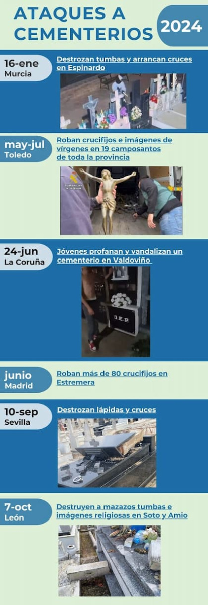Hasta el 31 de octubre, los cementerios cristianos atacados o profanados durante 2024 ascendía a un total de 21 casos, según el mismo Observatorio.