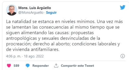 Tuit del 18 de agosto de Luis Argüello comentando la nueva ley de aborto del Gobierno español