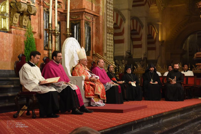 El arzobispo Asenjo, de Sevilla, con el báculo episcopal, en la catedral de Córdoba