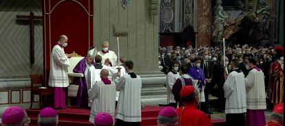 - el Papa en San Pedro del Vaticano, acompañado de obispos y sacerdotes vestidos de morado, el color penitencial;