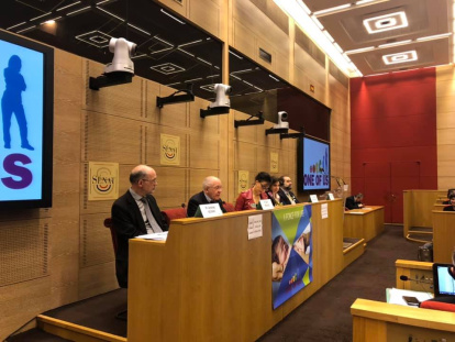 El historiador Rémi Brague, autor del Manifiesto One of Us, lo lee en el encuentro de presentación en las instalaciones del Senado francés
