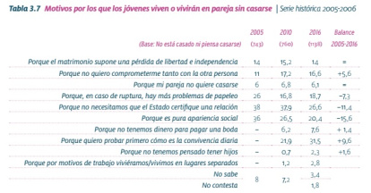 El casi 19% de jóvenes españoles que piensan en cohabitar "para ahorrar papeleo en caso de ruptura" es ya un indicador de fragilidad, así como el casi 17% que admite que no está muy seguro con la persona con la que cohabita.