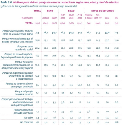 Otro 20% declaraba que les era "conveniente" (por razones prácticas y económicas). Un 13% de mujeres y un 6% de hombres declaraban que dieron el paso para educar juntos un hijo. Y aproximadamente un 14% pensaba que así daban "un paso más en su compromiso".