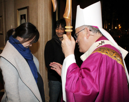 El arzobispo Chaput, de Filadelfia, bendice a un bebé y a su mamá