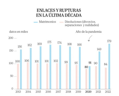Entre finales de 2023 y principios de este año salían a la luz las alarmantes cifras de divorcios y rupturas matrimoniales en países de todo el mundo. En España, el INE hizo públicas las más de 84.000 disoluciones matrimoniales efectuadas en 2022, cifra cercana a la mitad de enlaces matrimoniales, casi 180.000. En Estados Unidos fueron 700.000 los divorcios, también muy cercana al 50% de matrimonios.