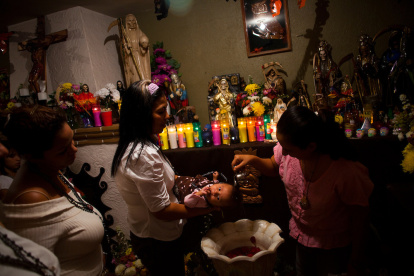 Una mujer bautiza a su bebé en el culto a la Santa Muerte, pensando que eso le aportará protección o prosperidad