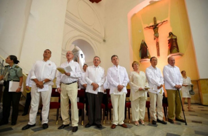 El presidente Juan Manuel Santos se sentó en primera fila en la catedral San Pedro Claver acompañado de los presidentes de Ecuador -Rafael Correa-, del dirigente cubano Raúl Castro, de la presidenta de Chile, Michelle Bachelet [tres dirigentes de izquierdas], del secretario de la ONU, Ban Ki Moon y de Juan Carlos I, Rey Emérito de España.