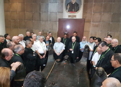 Los obispos de Latinoamérica, reunidos para la cumbre del CELAM, el pasado 12 de mayo, oran en la tumba del beato Romero en San Salvador