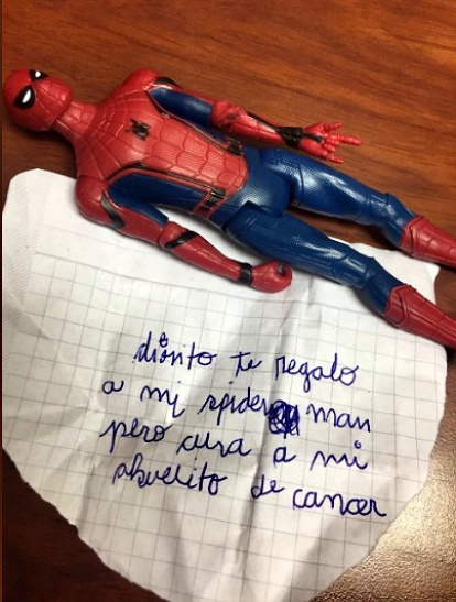 "Te regalo a mi Spiderman, pero cura a mi abuelito de cáncer”, dice la nota encontrada el miércoles 25 de octubre por la profesora de religión, Sol Yturralde, quien decidió tomarle una fotografía junto al muñeco y compartirla en las redes sociales.