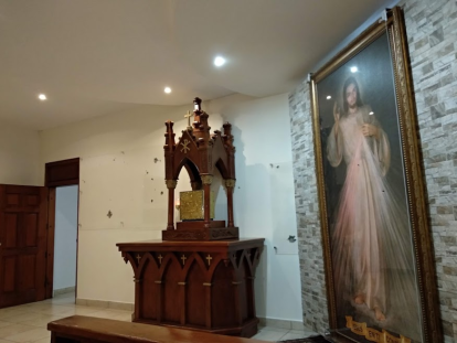 El P. Zamora, junto al Sagrario, la imagen de la Divina Misericordia y todos los impactos de bala