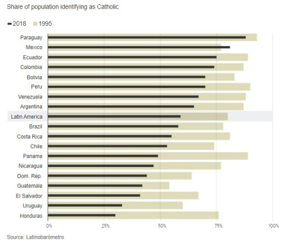 La Iglesia católica ya no es mayoritaria desde hace años en Uruguay y en toda América Central salvo Costa Rica. Según el Latinobarómetro, eso mismo ocurrirá a lo largo de este año 2022 en Brasil, el país con mayor número de católicos del mundo.Este declive inexorable, del que son beneficiaros principalmente los grupos pentecostales, adquiere una dimensión histórica que ha llamado la atención del Wall Street Journal, que publicaba este martes un amplio reportaje al respecto.