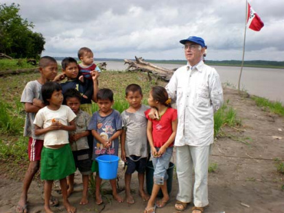 El misionero franciscano, con unos niños junto al río Ucayali.