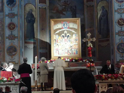 La llegada del Papa a la Isla Tiberina fue festiva. Le recibieron con entusiasmo muchas personas, jóvenes y niños de las Escuelas de la Paz. Los niños le entregaban cartas y dibujos. Pero una vez entró en la basílica de los nuevos mártires se impuso la solemnidad. Ante el icono del altar principal, que recuerda a los nuevos mártires, el Santo Padre rezó algunos instantes en silencio. El incienso y cantos polifónicos fueron parte de la liturgia, en la que el papa vestido de blanco usó la estola roja de un obispo que murió mártir.