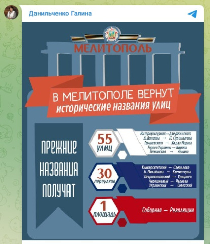 “En 2016, como parte de la llamada descomunización de Ucrania, se cambió el nombre de muchas calles de Melitópol en honor a los ideólogos nazis ucranianos, intentaron borrar nuestros nombres históricos”, escribe Danilchenko en su Telegram, considerando nombres "históricos" los nombres soviéticos. Anuncia que pronto se cambiarán las placas con los nombres de las calles y la documentación.