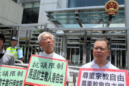 En el centro con alzacuellos, el cardenal Zen pide desde Hong Kong la libertad del obispo de Shanghai, Tadeo Ma Daqin, en una protesta de 2013 (monseñor Ma Daqin sigue preso)