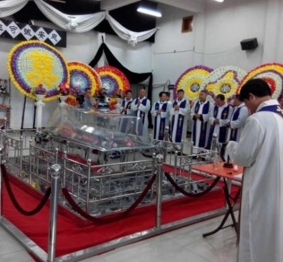 El cadáver del obispo Huang, de Mindong, con su báculo y mitra hechos con flores