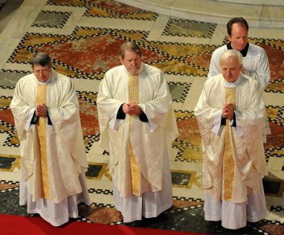 Los obispos anglicanos Newton, Burnham y Broadhurst dejaron la Iglesia de Inglaterra y se hicieron católicos, los tres primeros en el ordinariato para ex-católicos en el país; en la foto vemos su ordenación como sacerdotes católicos; Newton, como ordinario, pastorea 50 comunidades en Gran Bretaña