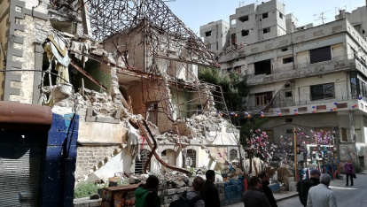 Hoy los escombros han sido retirados de las calles y aunque aun es difícil que entren los coches, se puede andar con cierta normalidad. Entre los edificios destaca el Palacio Haiyar, un palacete que era una de las joyas arquitectónicas de Homs. Los vecinos han colocado unas imágenes del Via Crucis y una gran cruz delante del edificio, todo rodeado de ruinas. “Esta era una zona mayoritariamente cristiana, seguimos conservando el mismo ambiente, aunque la mayoría de los vecinos aún no han regresado”, comenta Marwan, hijo mayor de Evon.