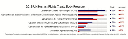 Según la investigación llevada a cabo por C-Fam en relación a 2018, una gran parte de las observaciones concernientes a seis de los tratados internacionales más importantes incluyen impulsar el aborto y los temas LGBT, incluidos ambos en la categoría de "orientación sexual e identidad de género" (SOGI, por sus siglas en inglés), a pesar de que ninguno de estos seis tratados incluya referencias directas al aborto o a los "nuevos derechos" gay: esto es igual que firmar un pacto y ver que, a posteriori, se avanzan pretensiones que el pacto no contemplaba. Por ejemplo, en el año que acaba de concluir, el 88% de las observaciones finales presentadas por el comité que debería vigilar sobre el respeto de la convención para la eliminación de todas las formas de discriminación contra las mujeres (Cedaw) está relacionado con la petición de liberalizar el aborto, con contenidos variables según la legislación del país destinatario de la petición.