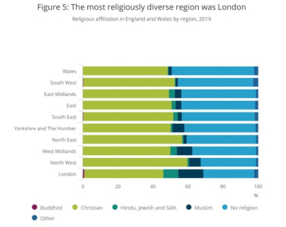 En la región de Londres, con 9 millones de habitantes, la religión está más viva (y también es más diversa): un 14% se declaran musulmanes en esta región, y los "sin religión" son un 29%.