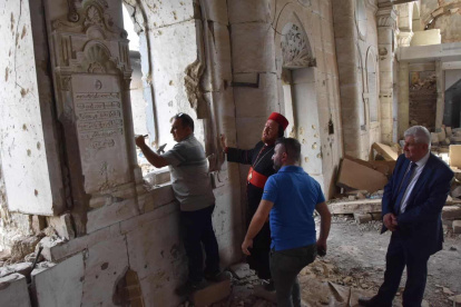 El obispo siro-ortodoxo de Mosul, Nicodemos Sharaf, con los trabajadores en la iglesia de Santo Tomás en Mosul.