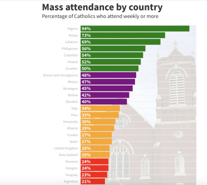 Según el Centro de Investigación Aplicada en el Apostolado (CARA), de la Universidad de Georgetown (EE.UU), el 94% de los 30 millones de católicos de Nigeria asiste a misa al menos semanalmente, mientras que en países como EE.UU. solo se alcanza el 17%.
