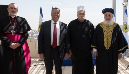 Encuentro de líderes de religiones en Jerusalén durante la pandemia del coronavirus; a la izquierda, el arzobispo Pizzaballa, Patriarca Latino; a la derecha del todo, el Rabino Jefe sefardí de Jerusalén, Shlomó Moshé Amar.