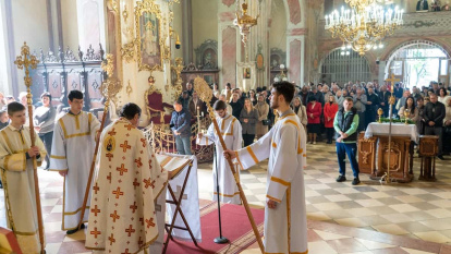 Divina Liturgia en abril de 2024 en la catedral grecocatólica de la diócesis de Mukachevo, en Transcarpatia, en la ciudad de Úzhgorod, frontera con Hungría; peculiar mezcla de arquitectura neoclásica con liturgia bizantina.