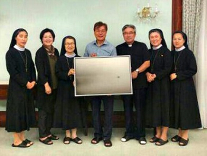 El presidente surcoreano junto con su esposa, el sacerdote que bendijo la residencia, y algunas religiosas que le acompañaron.