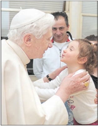 Y después Benedicto XVI entra en la habitación número 22, donde está Benedetta. Nació hace un año con una gravísima malformación cerebral. Sus padres, al verla nacer así de desfigurada la abandonaron y huyeron del hospital. Las enfermeras del servicio acogieron a Benedetta, le dieron este nombre. La cuidan como si fuera la hija de cada una de ellas. La colman de amor.