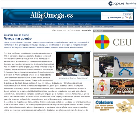 A raíz del 1er. Congreso Internacional "Creo en internet", Alfa y Omega publicó una reseña donde recoge algunas de las intervenciones de los ponentes, entre los que se encontraba quien escribe (la republico íntegra al final de este post). El martes 29 de noviembre recibí en Roma un sobre marrón con una copia de Alfa y Omega. Agradezco el detalle del director, Miguel Ángel Velasco Puente, y el artículo firmado por Dn. José Luis Vázquez Díaz-Mayordomo. Un acto de generosidad realmente inesperado que mueve a seguir valorando mucho el trabajo que realizan con tanta profesionalidad. Me parecía de justicia agradecerle ´(y de paso a la agencia Europa Press quien también hizo un reportaje donde cita a nuestro blog).