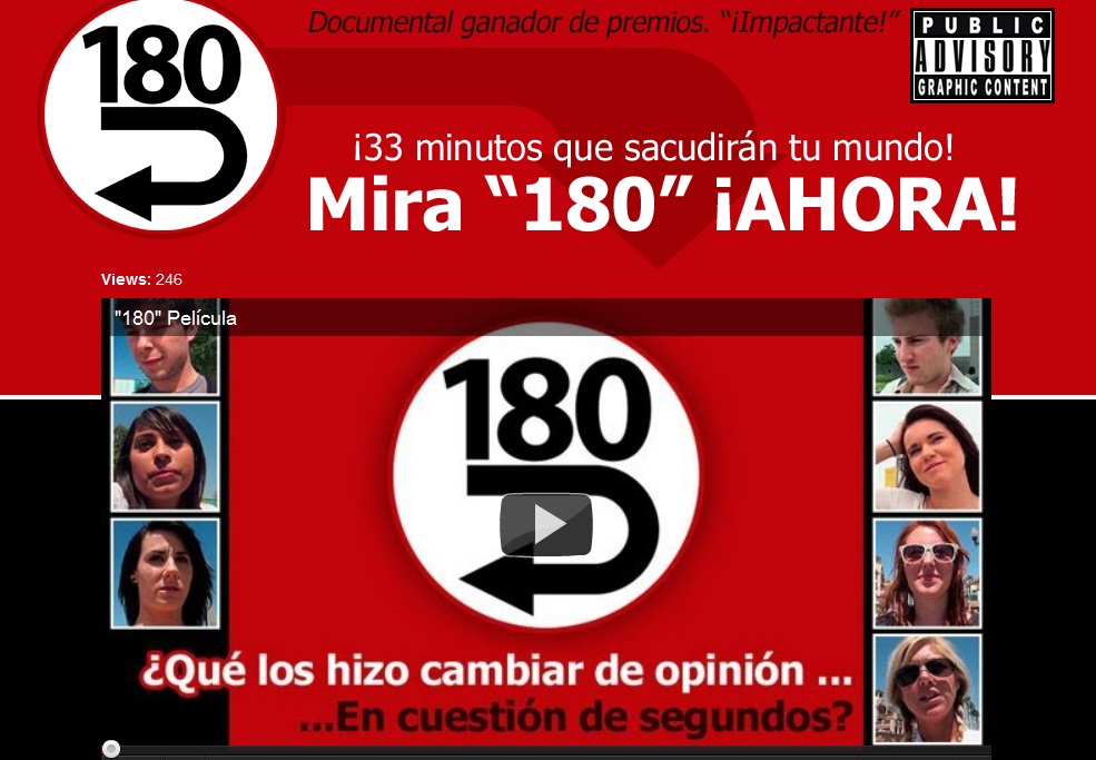 El 27 de septiembre de 2011 publicamos una nota sobre 180 (180 cambios radicales en un documental: de pro abortos a pro vida), un documental que muestra cómo algunas personas cambian de una postura pro aborto a la defensa de la vida mediante un método que pueden ver y conocer en el video que ahora está disponible en español (lo anexo al final). Lo mejor es que no son subtítulos sino propiamente un doblaje. Material de valor para usar en exposiciones a jóvenes y, en general, para ver, discutir y compartir.