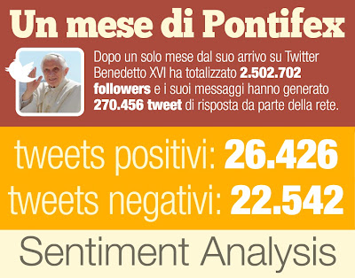 De los 270,456 mensajes de respuesta generados en el primer mes (diciembre 2012-enero 2013), los de contenido positivo son superior a los de contenido negativo (26.426 contra 22.542). Los restantes 200 mil son clasificados como neutros. El análisis se detiene en los 100 mensajes top de respuesta evidenciando que los mensajes negativos se concentran en temáticas específicas como sacerdotes pedófilos (26%), injurias contra el Papa (25%), críticas al poder y «riquezas» del Vaticano (20%), ironía y sátira (16%), cuestiones relacionadas a las uniones gays (8,5%) y críticas a la fe (2,5%); mientras que los positivos son, sobre todo, re-envíos de las palabras de Benedicto XVI (26,5%), agradecimientos y buenos deseos (25%), petición de oraciones (16,6%), comentarios sobre el evento (12%), temas existenciales (7,6%) y respuestas en defensa del Papa (7%).