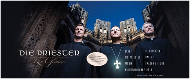 Primero fue el trío irlandés «The Priests» (http://www.thepriests.com/), luego vino el trío francés «Les Pretres» (http://www.les-pretres.fr/) y ahora, más recientemente, desde Alemania llega otro trío de sacerdotes. Se llaman «Die Prester» (http://www.diepriester.com/) y, como los irlandeses y franceses, están en el top ten de la música europea cantando, nada más ni nada menos, una forma de «canto gregoriano» un tanto «actualizado»: un «gregoriano pop».