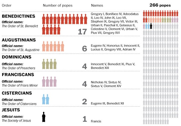 Para ver en tamaño más grande basta hacer clic encima de la imagen.Papa Francisco hace historia no sólo por ser el primer Papa latinoamericano en la historia de la Iglesia sino también por ser el Papa número 34 que procede de una Orden religiosa: la Compañía de Jesús (jesuitas).