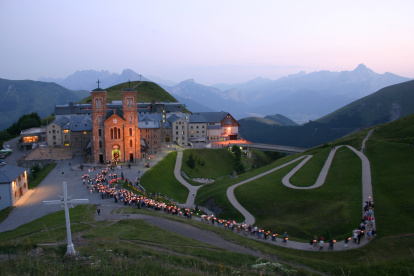 El santuario en la montaña, a 1.800 metros en los Alpes franceses sigue recibiendo peregrinos y acoge Eucaristías, el rezo meditado del rosario, las vigilias y las procesiones.