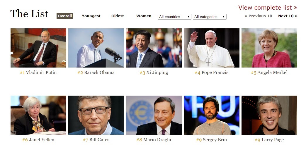 El top ten de la lista 2014 de Forbes la completan Vladimir Putin (1), Barack Obama (2), el presidente chino Hu Jintao (3), la canciller alemana Angela Merkel (5), Janet Yellen, Bill Gates, Mario Draghi, David Cameron y Larry Page-Sergey Brin, de Google.