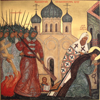Icono moderno recordando 1917: los bolcheviques, con estrella roja en el gorro, persiguen a la Iglesia, simbolizada en un monje y un obispo. Bajo el Gobierno de Lenin 16.000 clérigos ortodoxos fueron asesinados en siete años.