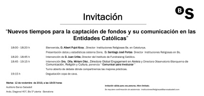 En la cita del martes en Barcelona se hablará de todo esto, de como adaptar la captación de fondos y su comunicación a entornos católicos. Los interesados en asistir deben antes comunicar su asistencia escribiendo a institucionesreligiosas@bancsabadell.com
