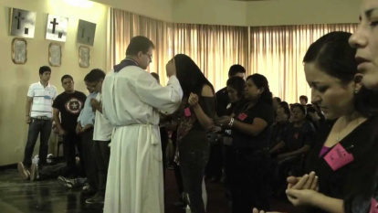 El padre Santarelli predica sobre el eficaz gesto de orar imponiendo las manos... algo que pueden hacer también los laicos