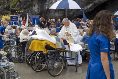 Un sacerdote ora por unas enfermas en silla de ruedas... forma parte de la misión del sacerdote abrazar su vocación sanadora