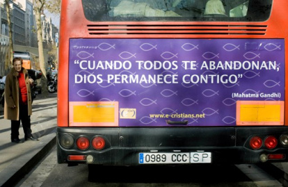 En enero de 2009 la asociación E-Cristians, con donativos de socios y una colecta particular, aprovechó la idea y llenó los autobuses de 3 líneas en Barcelona con una frase de Gandhi que buscaba llevar a la reflexión espiritual: "Cuando todos te abandonan, Dios sigue contigo".