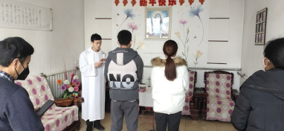 Un sacerdote visita un hogar chino durante las primeras semanas de cuarentena