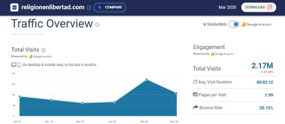 Según los datos de Similar Web, el portal dirigido por Álex Rosal consiguió 2,17 millones de sesiones (concepto que analiza esta herramienta web en sus ránking) y se consolida como líder entre las publicaciones digitales nativas de España. De hecho, en febrero esta publicación llegó a alcanzar cifra de 3,45 millones de sesiones. Religión en Libertad, propiedad de la Fundación Nueva Evangelización para el siglo XXI, cuenta además con Carmelo López-Arias como subdirector, Pablo J. Ginés como redactor jefe y Javier Lozano como coordinador de redacción.