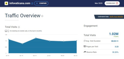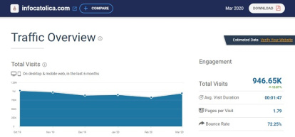 Utilizando para ello Similarweb, herramienta de referencia en el ámbito del márketing y la comparativa de audiencias, este portal aparece en el mes de marzo en primer lugar con 2,17 millones de sesiones, situándose muy por encima del resto de publicaciones, con Vida Nueva en segunda posición a casi un millón de sesiones e Infovaticana en tercer lugar a casi 1,2 millones.