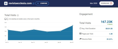 La revista Ecclesia se coloca según este ránking en el séptimo lugar al conseguir el pasado mes de marzo 167.230 sesiones. Esta publicación ha cumplido 75 años de vida. Es la revista española pionera en la información eclesial desde el año 1941. Es propiedad de la Conferencia Episcopal Española y su directora es actualmente Silvia Rozas Barrero.