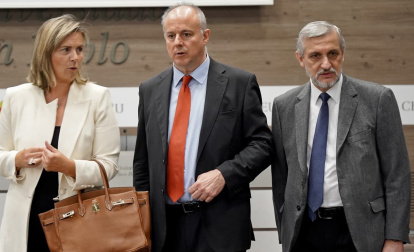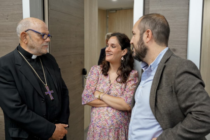 Cristina Cort, de la Fundación Cari Filii, con el director adjunto de ReL, Carmelo López-Arias, y José Mª Gea, secretario del obispo Reig Pla.