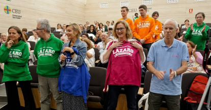 El Premio Caridad en Acción se concedió a la Fundación Lázaro España , por su experiencia de hogares en los que conviven voluntarios y personas que han salido de las calles. Sus sudaderas de colores alegres llenaron de esperanza la sala y los corazones. El sacerdote Álvaro de Cárdenas explicó con gran detalle las intuiciones espirituales de esta iniciativa inspiradora.