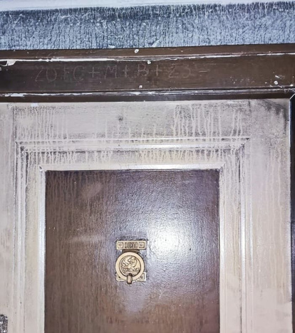Las marcas con tiza "20+C+M+B+23" todavía visibles sobre la puerta de Alexander tras el incendio.